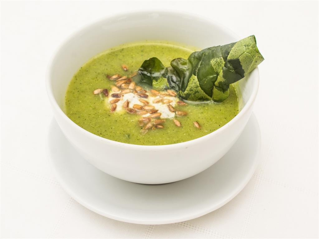 Kalarepy i cukinie pokroić, dodać do gotującego się bulionu. Po ok. 15 minutach, gdy warzywa staną się miękkie, zmiksować zupę i doprawić solą. Śmietanę wymieszać z serem (w celu uzyskania jednolitej konsystencji użyć blendera), udekorować nim zupę. Pestki słonecznika smażyć przez chwilę na suchej patelni, posypać nimi zupę.