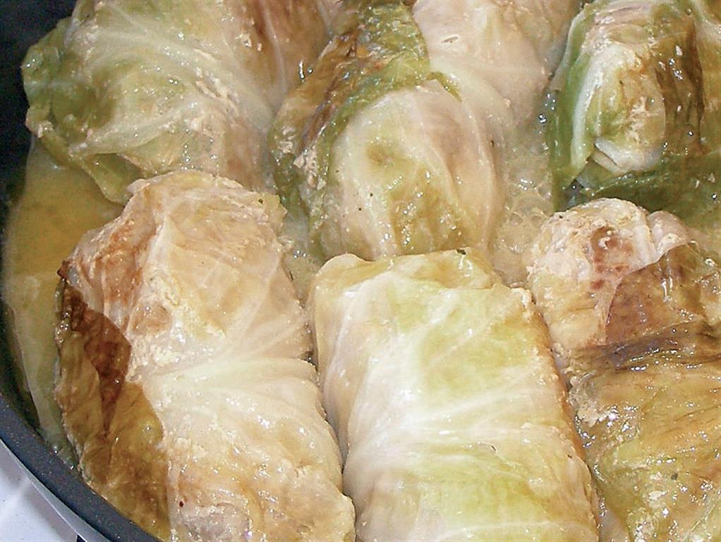 Liście z młodej kapusty obieramy i osobno sparzamy. Ryż gotujemy na sypko. Świeży karczek mielimy na drobnym sicie. Cebulę kroimy na cztery części i przesmażamy na maśle, następnie mielimy ją i dodajemy do mięsa, do którego dodajemy również ugotowany wcześniej ryż. Do farszu dodajemy jajka, pieprz i sól do smaku.
