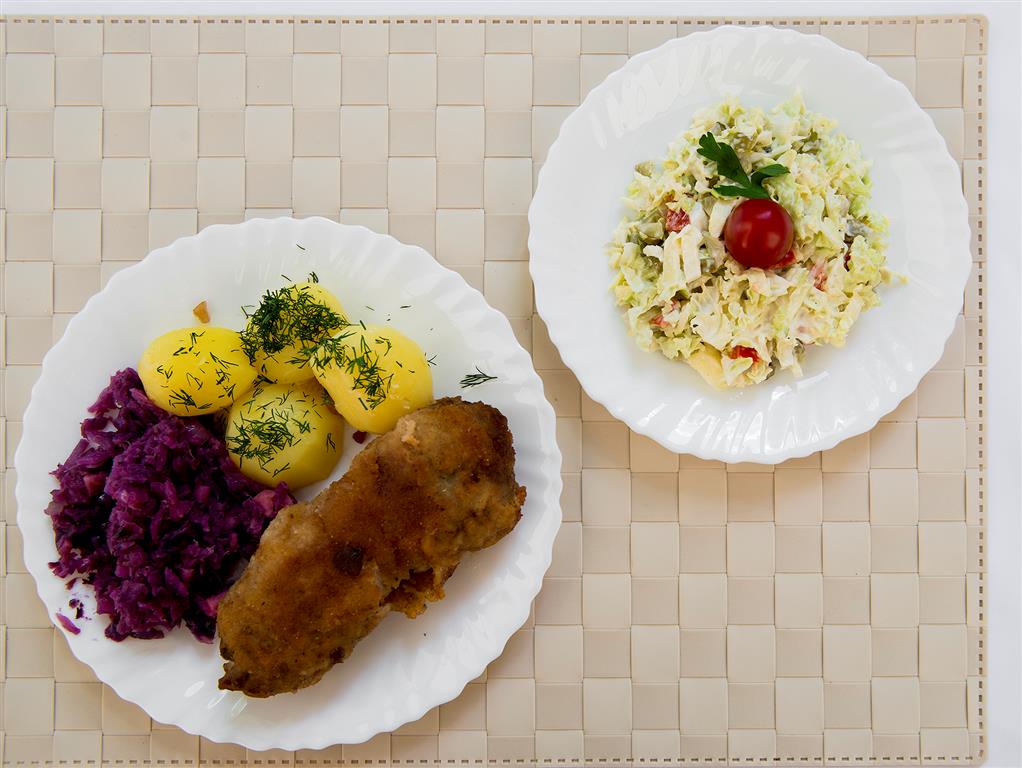 Pstrąga przyprawiamy, panierujemy w płatkach migdałowych i smażymy na klarowanym maśle. Następnie przekładamy do pieca. Kulki z surowych ziemniaków smażymy na głębokim tłuszczu. Z pomidorów, cebuli i czosnku sporządzamy surówkę.