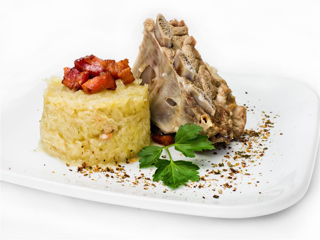 Kapustę ugotować, dodając kilka ząbków drobno pokrojonego lub przeciśniętego przez praskę czosnku, pokrojoną cebulę i przyprawy. Na patelni usmażyć pokrojony w kostkę boczek. Z mąki zrobić zasmażkę. Ugotowaną kapustę zagęścić zasmażką i startym ziemniakiem. Dodać skwarki z boczku i dokładnie wymieszać. Podawać z ugotowanymi żeberkami.