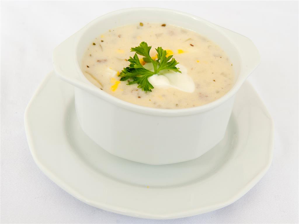 Zagotować kość wołową, następnie dodać śmietanę, rozmąconą z jajkami i mąką. Doprawić do smaku i posypać posiekanym koperkiem.