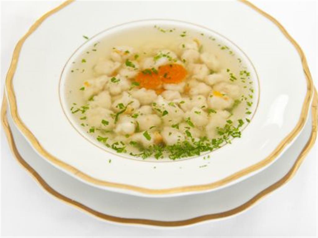 Wyczyszczoną kaczkę z warzywami i przyprawami gotujemy na małym ogniu przez 2 godziny; odcedzamy. Makaron gotujemy i odcedzamy. Wątróbkę drobno kroimy, dodajemy do niej kaszę mannę, majeranek, sól, pieprz do smaku. Z tak przygotowanej masy formujemy małe kluseczki, które potem wrzucamy do gotującego się rosołu. Przed podaniem dodajemy makaron i natkę lubczyku.