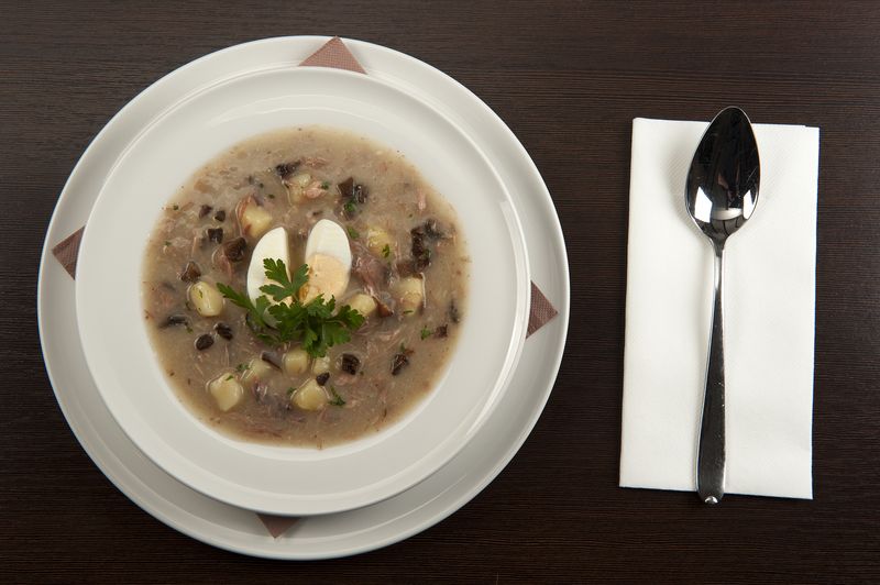 Tradycyjną zupę gotujemy na wywarze z wędzonych kości z dodatkiem warzyw (marchew, pietruszka, seler) oraz kiełbasy i grzybów. Podprawiamy zakwasem z mąki żytniej, dzięki czemu uzyskujemy jedwabistą konsystencję i lekko kwaśny smak. Podajemy w charakterystycznym, „wydrążonym” bochnie chleba.