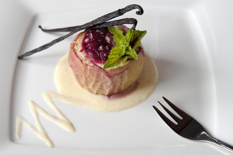 Bardzo ciekawy i delikatny deser. Pieczone jabłko nadziewane żurawiną podane z sosem waniliowym przygotowanym przez szefa kuchni.