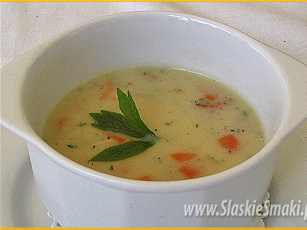 Z 3/4 boczku gotujemy wywar. Obrane ziemniaki kroimy w kostkę i gotujemy na wywarze z boczku. Ugotowany boczek wyjmujemy i kroimy w plastry. Pozostały kawałek surowego, wędzonego boczku kroimy w kostkę i topimy na skwarki, dodając pod koniec pokrojoną w kostkę cebulę. Gdy ziemniaki będą miękkie skwarki, tłuszcz i cebulę łączymy z zupą. Wlewamy zakwas i doprowadzamy do wrzenia. Dodajemy czosnek roztarty z solą. Przyprawiamy cukrem, majerankiem i solą.