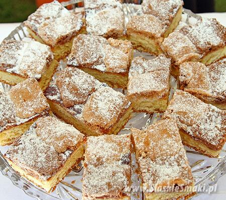 Sieve flour. Prepare leavening of milk and yeast, and pour it into the sieved flour. Beat eggs with sugar. Melt butter. When the leavening doubles in volume, add the eggs with sugar and knead, adding the melted butter. Knead the pastry until it is not sticky and add salt. Separately, knead all the ingredients for sprinkles. Put the pastry in a baking tin and cover with sprinkles. Bake until golden brown.