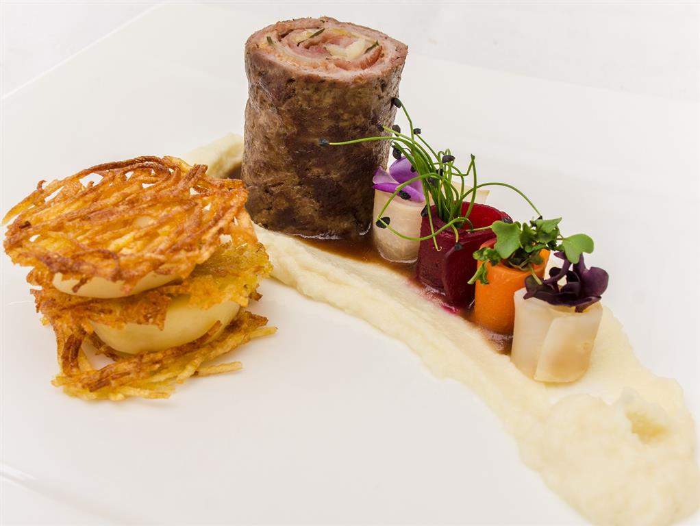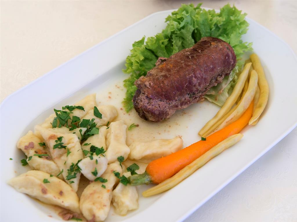 Traditional Silesian dinner served on Sundays: Beef roulade, Silesian dumplings and red cabbage. The roulade is filled with bacon, sour cucumbers, onion and mustard. It is very popular dish in the central part of the region.