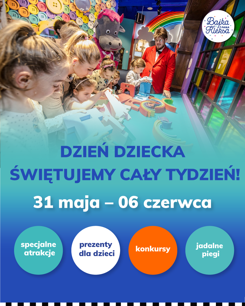 Z okazji Dnia Dziecka, katowicka Bajka Pana Kleksa świętuje nie jeden dzień, a cały tydzień! Od 31 maja do 6 czerwca na dzieci czekają specjalne atrakcje, prezenty i konkursy. Dzieci otrzymają także od Prof. Kleksa jadalne piegi, które z pewnością zachwycą wyszukane gusta najmłodszych. Świetna zabawa dla całej rodziny gwarantowana!
