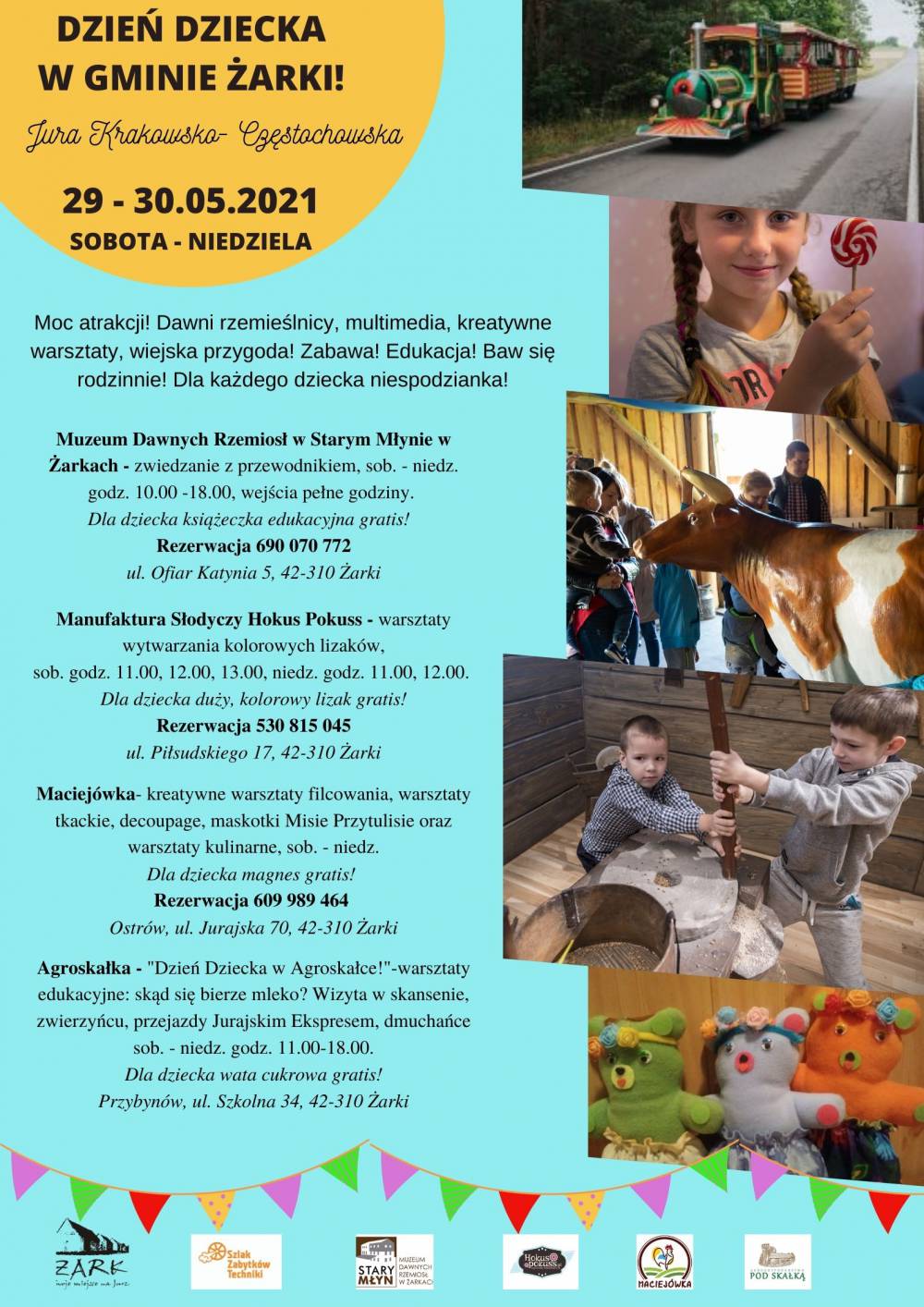 - Agroskałka – „Dzień Dziecka w Agroskałce!”, warsztaty edukacyjne: skąd się bierze mleko? Wizyta w skansenie, zwierzyńcu, przejazdy Jurajskim Ekspresem, dmuchańce, sob.- niedz. Godz. 11.00-18.00. Dla dziecka wata cukrowa gratis! Przybynów, ul. Szkolna 34, 42-310 Żarki