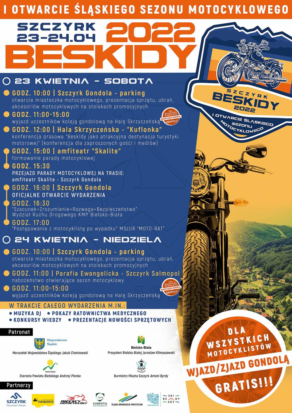 Już 23-24 kwietnia odbędzie się w Szczyrku wyjątkowe wydarzenie - 1.OTWARCIE ŚLĄSKIEGO SEZONU MOTOCYKLOWEGO BESKIDY 2022 Miasteczko motocyklowe zlokalizowane będzie przy dolnej stacji kolei gondolowej Szczyrk Mountain Resort, a w nim m.in. stoiska wystawców, muzyka, konkursy wiedzy, pokazy ratownictwa medycznego i prezentacje nowości sprzętowych.