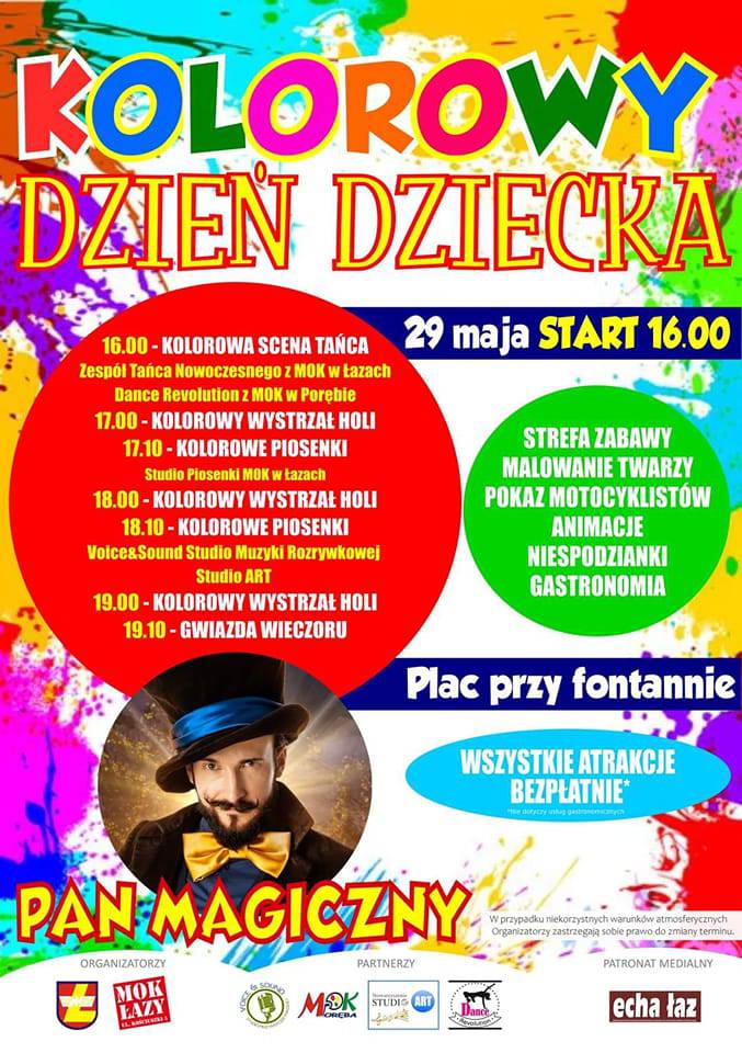 Gmina Łazy i Miejski Ośrodek Kultury zapraszają wszystkich do wspólnego świętowania. Kolorowy Dzień Dziecka! Na uczestników wydarzenia czeka moc atrakcji: animacje dla najmłodszych, dmuchańce, zabawa kolorowym proszkiem Holi, pokazy, występy artystyczne - kolorowa scena tańca i kolorowa scena piosenki, gwiazdą wieczoru będzie PAN MAGICZNY, który zaprezentuje niepowtarzalny pokaz iluzji.  Wydarzenie odbędzie się w dniach 29 maja na Placu przy Fontannie w godzinach 16.00 - 20.00. Serdecznie zapraszamy!!!