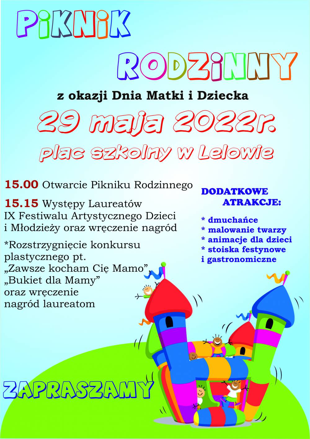 Serdecznie zaprazamy na Piknik Rodzinny organizowany z okazji Dnia Matki i Dnia Dziecka dn. 29.05.2022 na terenie placu szkolnego w Lelowie.