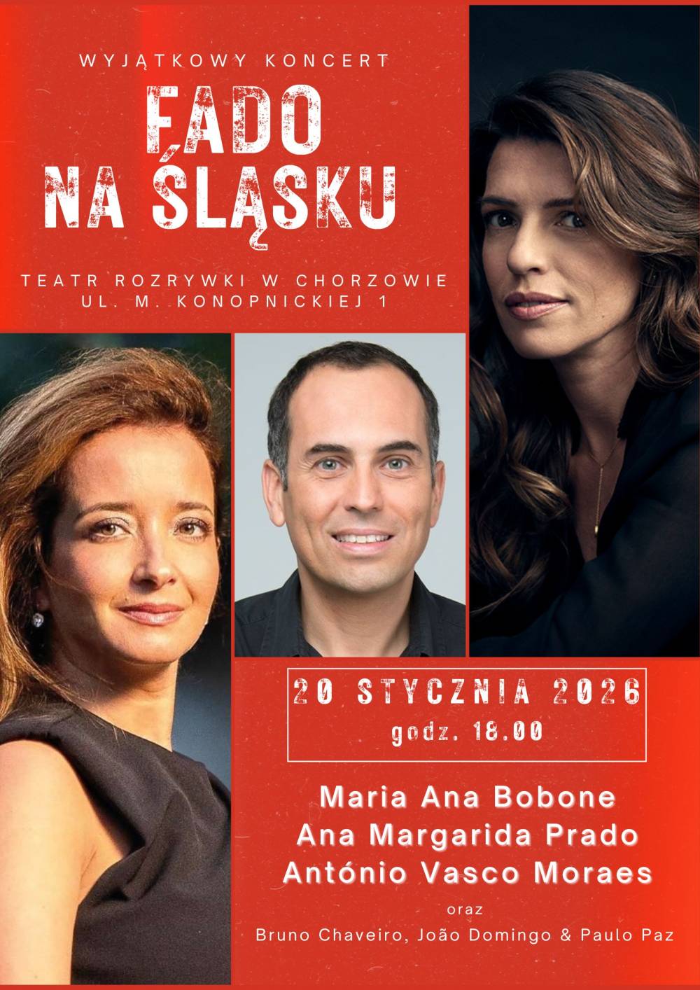 Zapraszamy na koncert gościnny - Fado na Śląsku, podczas którego wyjątkowi Artyści zabiorą publiczność do klimatycznej Lizbony. W tym czasie oczarują nas dźwiękami fado – niezwykłej muzyki rozbrzmiewającej każdego wieczoru w domach fado portugalskiej stolicy.