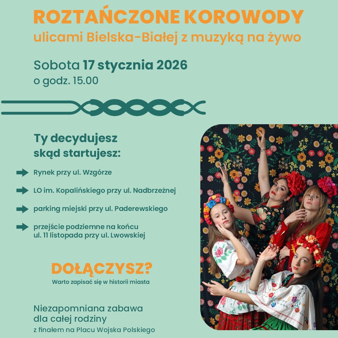Ceremonia otwarcia pierwszej Polskiej Stolicy Kultury odbędzie się w Bielsku-Białej już  17 stycznia. Zapoczątkują je korowody Polskiej Stolicy Kultury organizowane przez Miejski Dom Kultury – wydarzenia rodzinne, w które włączyć się mogą wszyscy mieszkańcy i goście. Warto ubrać się kolorowo, bo utworzone w wybranych częściach miasta cztery korowody mają być barwne. Każdy z nich będzie zmierzał na Plac Wojska Polskiego poprzedzany przez muzyków grających na żywo, a niektóre również przez szczudlarzy i żonglerów. Początek formowania się każdego z korowodów o godzinie 15.00.