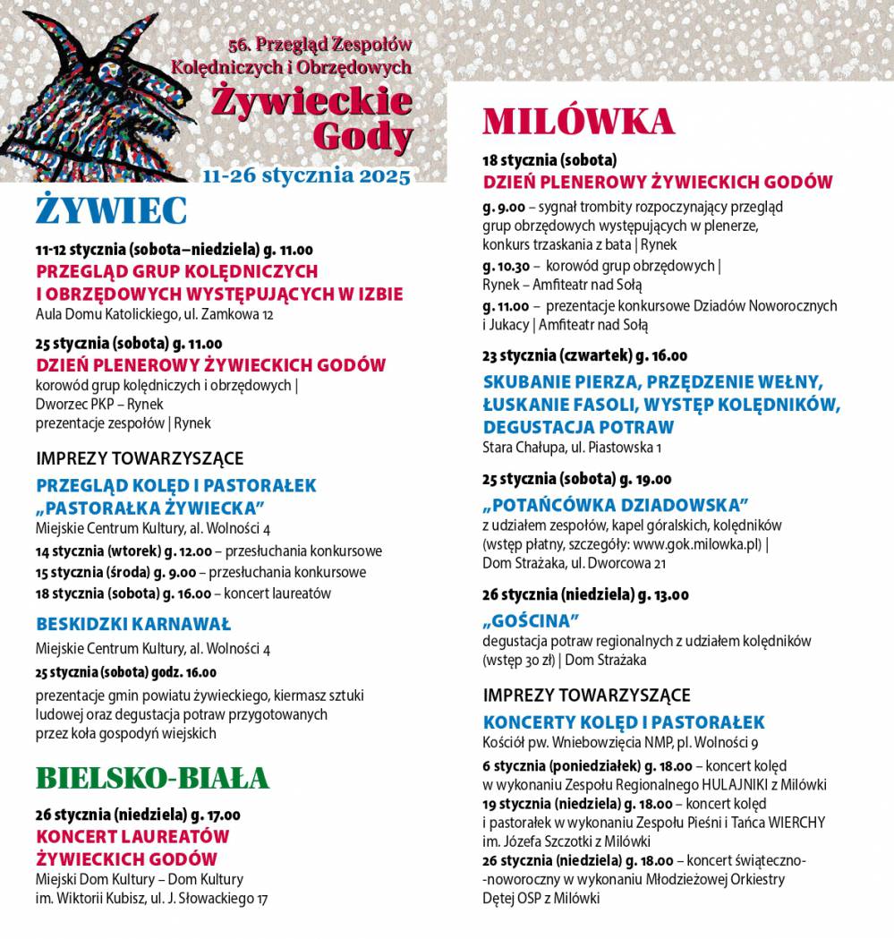 Styczeń to czas wydarzeń organizowanych w Beskidach w związku z tradycją kolędowania Dziadów Noworocznych - czekają nas przeglądy i dni plenerowe w Milówce, Żywcu i Bielsku-Białej. Zanim to jednak nastąpi chcemy spotkać się z mieszkańcami stolicy województwa śląskiego, aby tam z bliska pokazać żywą tradycję kolędowania, która od wieków odbywa się na południu naszego województwa. Podczas przemarszu spotkamy się z blisko 50-cio osobową grupą dziadów Żywieckich, którzy w barwnych strojach i z muzyką przejdą ulicami Katowic i Bielska-Białej.