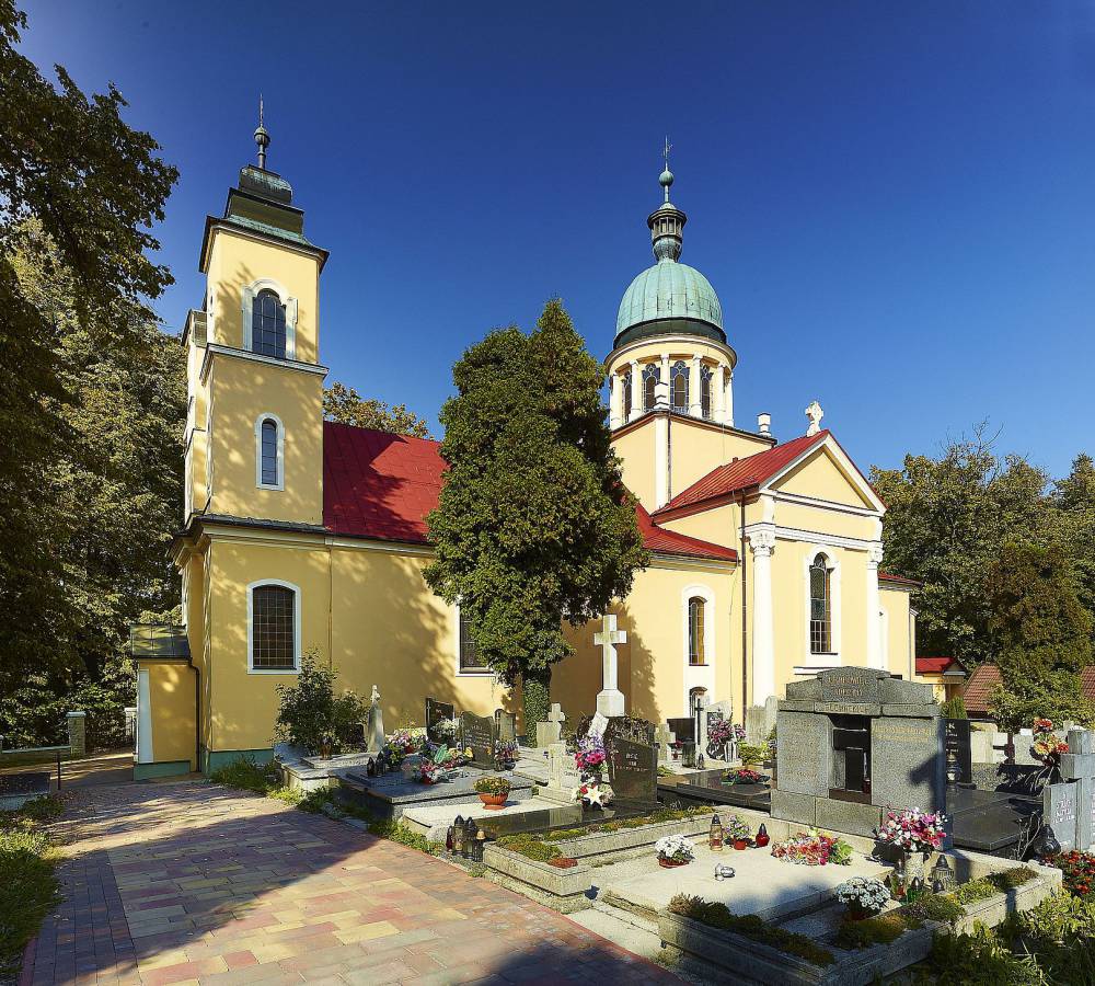 Parafia katolicka funkcjonowała tutaj najpewniej od XV stulecia. Wiernym musiała służyć drewniana kaplica lub niewielki kościółek. Chylący się ku upadkowi drewniany kościółek postanowił zastąpić murowanym baron Arnold Saint Genois d’Anneaucourt. Budowę rozpoczęto w 1802 roku i w następnym zakończono. Powstał skromny klasycystyczny obiekt. W latach 80. XIX wieku dostawiono do niego m.in. zakrystię i poszerzono prezbiterium. Kolejna modernizacja nastąpiła w latach 30. ubiegłego wieku. Jej efektem jest chociażby charakterystyczna kopuła nad przecięciem nawy z transeptem. Wystrój kościoła jest barokowy i klasycystyczny. W ołtarzu obraz Matki Bożej Berdyczowskiej z początku XIX wieku. Witraże ufundował jeden z właścicieli kurortu hrabia Larisch Moenich. W przedsionku – tablica erekcyjna z kolorowymi herbami Saint Genois d’Anneaucourt. W kopule wieży kościoła znajduje się lęgowisko chronionego gatunku - sowy płomykówki. Stanowi ono jedno z dwóch znanych lęgowisk na Podbeskidziu. Na cmentarzu przy kościele znajduje się, w tzw. „kwaterze hrabiowskiej”, klasycystyczny obelisk oraz kilkanaście płyt nagrobnych rodziny Laschowskich i Saint Genois d’Anneaucourt z XIX w. Ponadto na cmentarzu znajdują się dwa krzyże zabytkowe oraz siedem zabytkowych grobów, w tym postaci zasłużonych dla Jaworza.