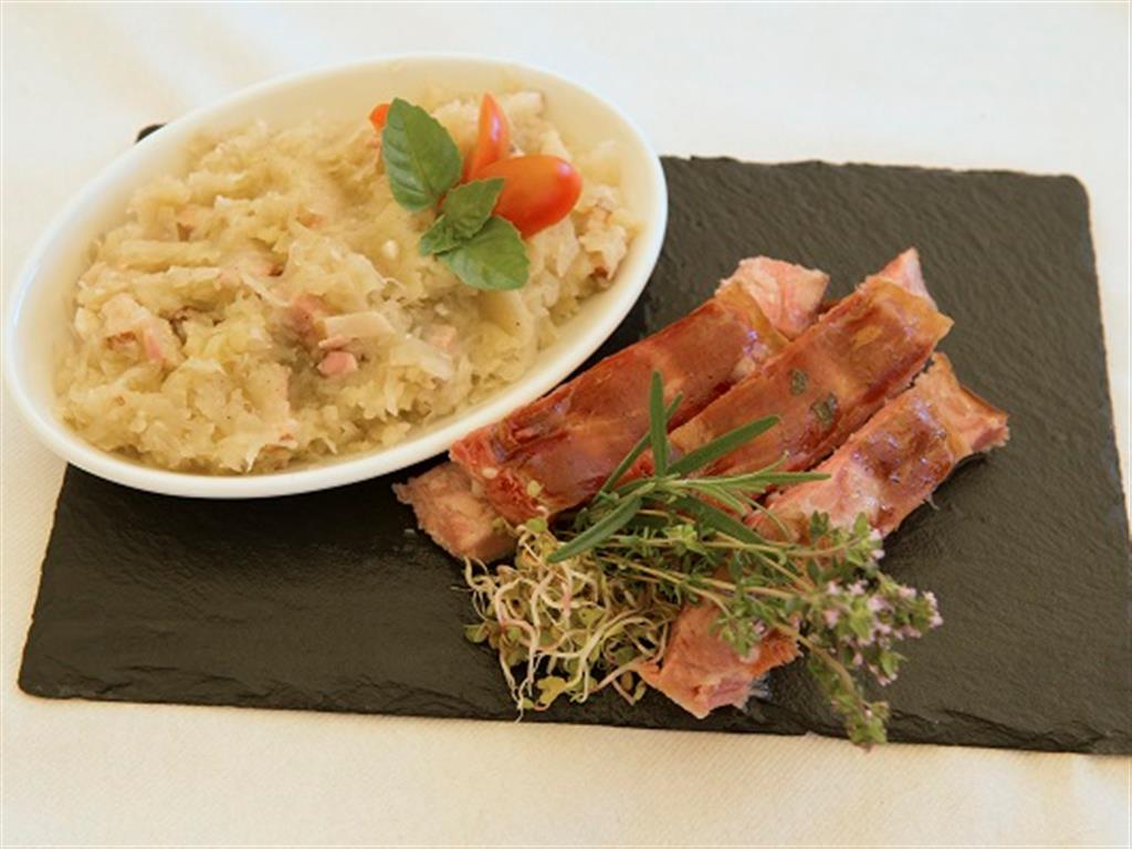 Pieczone żeberka podane na babraczce to danie obiadowe. Żeberka znane są w wszędzie, babaraczka jest jednak potrawą charakterystczną dla Śląska Cieszyńskiego. To bazujący na kapuście pyszny i energetyczny dodatek do mięs czy krupnioka.