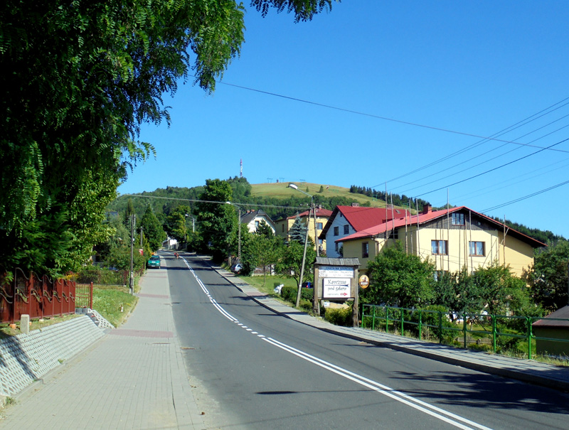 Szosa w centrum Koniakowa z Ochodzitą w tle, fot. Edward Wieczorek