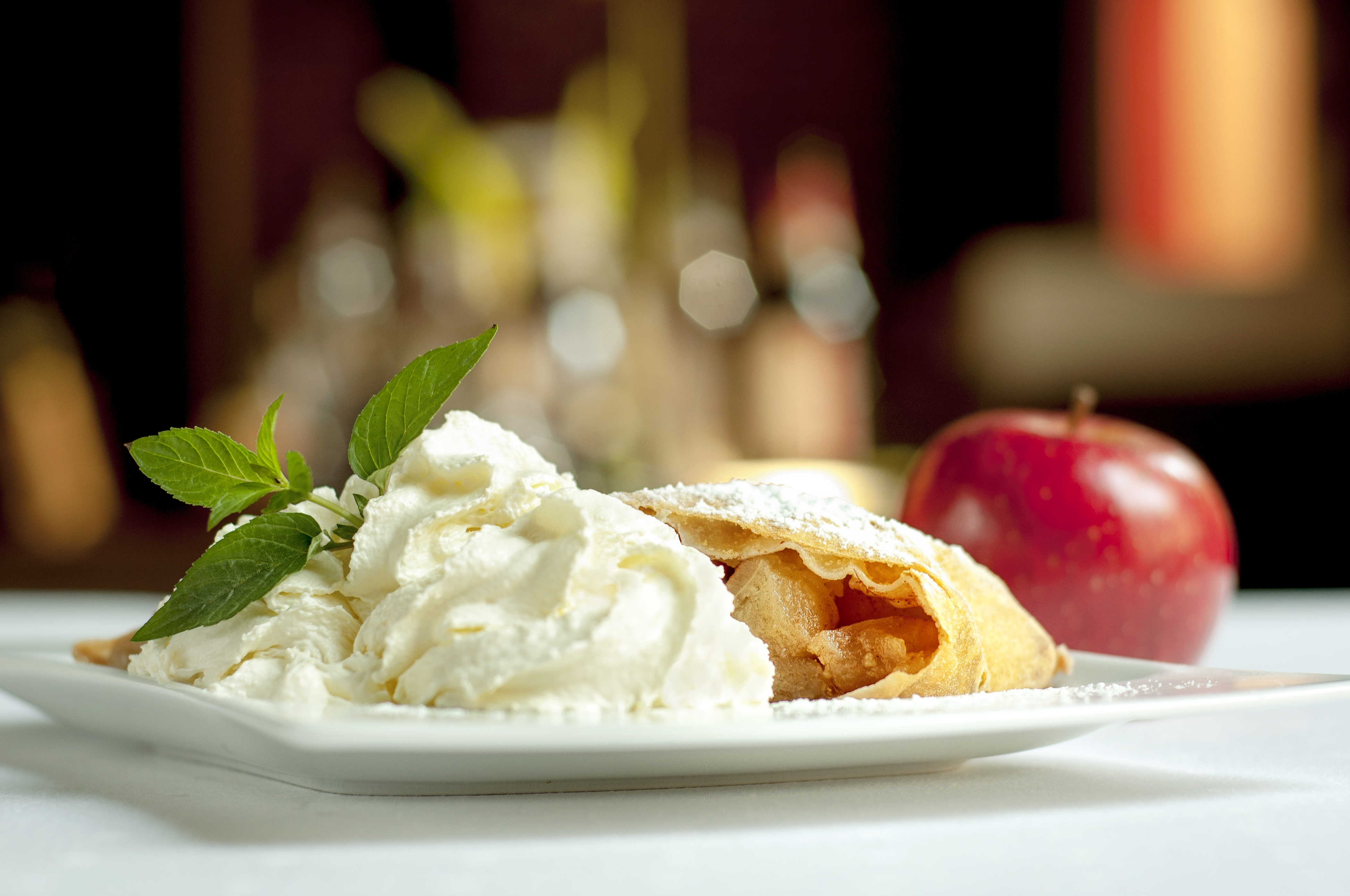 Strudel jabłkowy - wielowarstwowy zawijaniec oprószony cukrem pudrem - choć ma austriacki rodowód na stałe wpisał się także do kanonu deserów serwowanych w naszym regionie. Cieszyńska wersja tego deseru bazuje na cieście przygotowanym z dwóch rodzajów mąki, kwaśniej śmietany i żółtka oraz nadzieniu z podsmażonej na maśle bułki tartej z dodatkiem cukru i cynamonu, jabłek i bakalii. Sztrudel można podawać zarówno na zimno, jak i na ciepło z gałką ulubionych lodów. Szeroki asortyment lodów rzemieślniczych posiada cukiernia Consonni.
