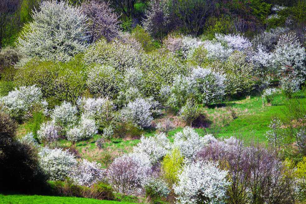 Po przeciwnej stronie znajduje się duży łan śliwy tarniny, która wiosną pięknie zakwita, przyciągając całą rzeszę zapylaczy. Zbliżając się wtedy do takiego drzewa ma się wrażenie, że jest się w samym środku ula. Pszczoły jednak są tak zajęte pracą, że zupełnie nie zwracają uwagi na człowieka. Tuż obok widzimy ogrodzoną łąkę, gdzie hodowane są daniele. Ich gody zwane bekowiskiem, odbywają się w październiku. Wydają wtedy z siebie odgłosy przypominające dźwięk kaszlu bądź odbijania. Trawa zgryziona jest tam do samej ziemi, dzięki czemu idealnie widać rzeźbę terenu. Doskonale widoczny jest efekt wypasu. Zwierzęta poprzez żerowanie nie dopuszczają do zarośnięcia łąki. Tuż za płotem gdzie ich nie ma drzewa całkowicie opanowały łąkę.