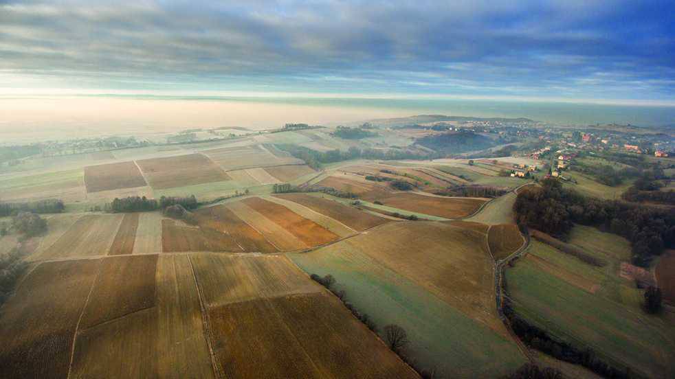 Po lewej stronie teren znacznie się podnosi, a pola poprzecinane są licznymi miedzami, przyjmującymi formę schodkową. Wiele z nich porośniętych jest krzewami obfitującymi w nasiona i owoce, którymi żywią się nie tylko ptaki, lecz także owady i gryzonie. Na polach z miedzami żyje dwukrotnie więcej gatunków zwierząt, niż w monokulturach. W praktyce miedza stanowi sąsiedzką granicę. Konflikt o miedzę stanowi jeden z motywów polskiej kultury, jak np. w powieści „Ogniem i mieczem”, czy filmie fabularnym, „Sami swoi”.