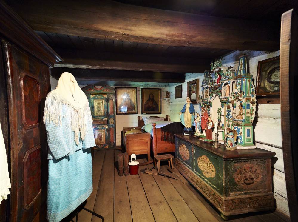 Pszczyna, Zagroda Wsi Pszczyńskiej, wnętrze izby paradnej chałupy z Grzawy, foto Tomasz Renk slaskie.travel