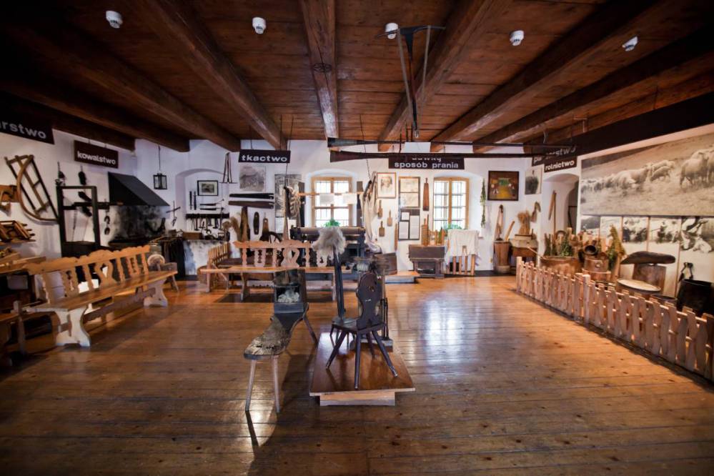We wnętrzach budynków zgromadzono wiele autentycznych sprzętów, są wśród nich m.in. rolnicze i rzemieślnicze narzędzia codziennego użytku, wozy i sanie towarowe, eleganckie bryczki, meble oraz ciekawe eksponaty sztuki ludowej.