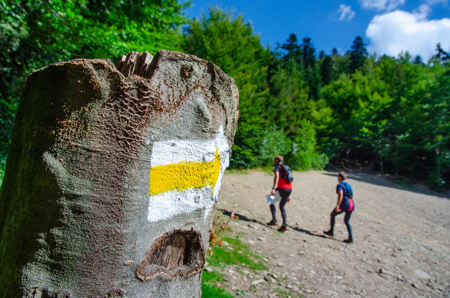 Szlak: żółty z Jeleśni do rozstaju pod szczytem Gachowizny, niebieski z Gachowizny do Huciska