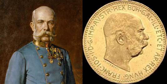 Portret cesarza Franciszka Józefa I i złota 20-koronówka z jego podobizną, foto domena publiczna