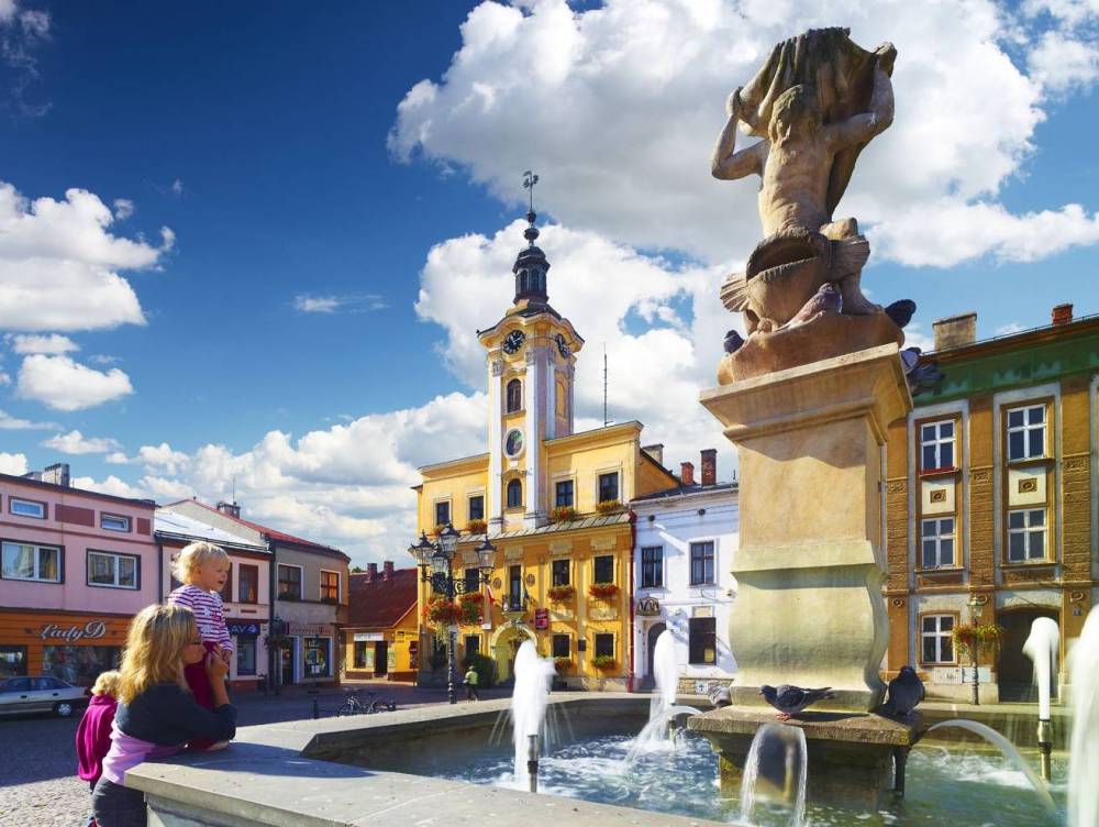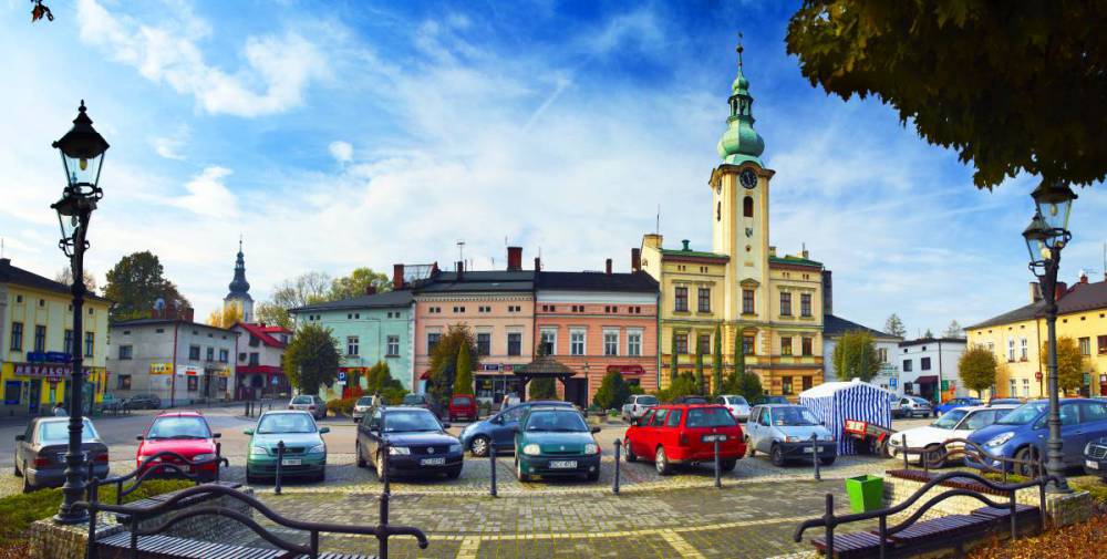 Skoczów, rynek z ratuszem. Biały budynek obok ratusza to Muzeum św. Jana Sarkandra, foto Tomasz Gębuś, slaskie.travel