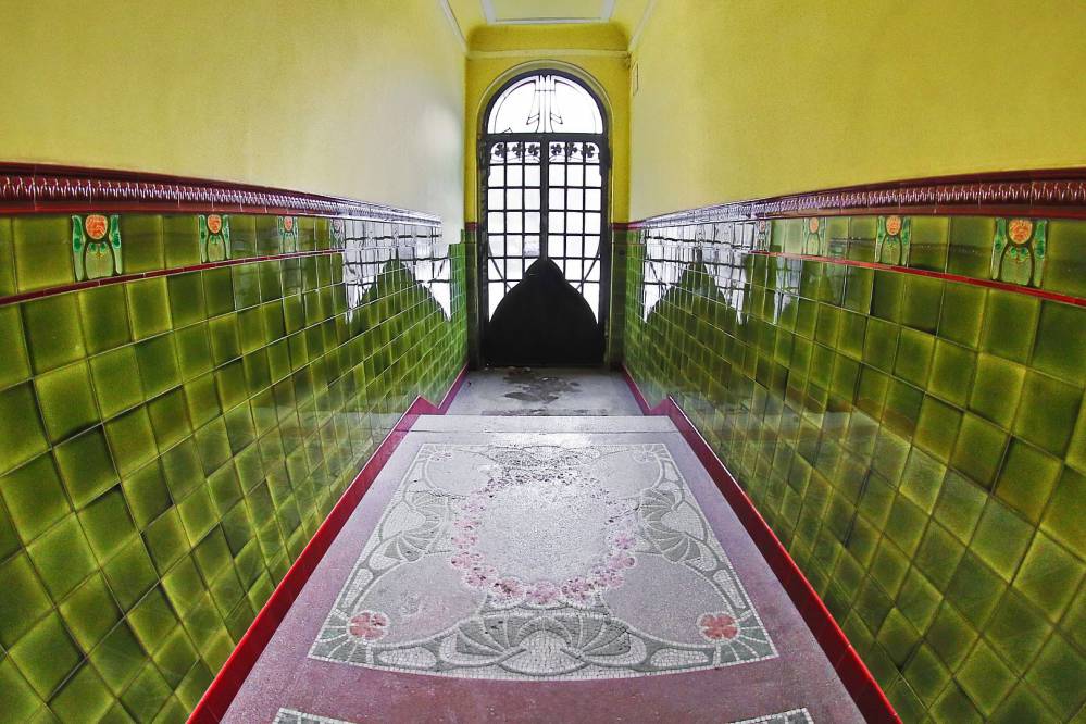 Wchodząc do kamienic, trzeba być szczególnie uważnym. Piękno i sztuka mogą bowiem pojawić się nie tylko pod stopami, jako cementowe posadzki, czy na ścianach pod postacią okładzin ceramicznych, malatur czy sztukaterii, ale i nad głowami jako... malowany podwieszany szklany sufit. Tuż za drewnianymi drzwiami z misternymi detalami snycerskimi, przywita nas para greckich bogów. Nad wejściem widnieje wizerunek bogini, odwzorowującej gałązkę oliwną na amforze. Mnemosyne to? A może Hebe? Z drugiej strony korytarza ujrzymy Hermesa, boga kupców i podróżnych ze swoimi nieodzownymi atrybutami – kaduceuszem, kapeluszem ze skrzydłami i sakiewką. Ich wizerunki widnieją na szklanym podwieszanym suficie, udekorowanym secesyjnymi gipsowymi elementami. Można również zauważyć miejsca dawnego montażu lamp. Ciekawostką jest, że na taką dekorację sufitu możemy natknąć się w przedsionku klatki schodowej. Zwykle były one montowane w sklepach i gdzieniegdzie istnieją do dziś, np. w Katowicach przy ul. Powstańców Śląskich 6, w Gliwicach przy ul. Dworcowej 32 oraz w Chorzowie przy ul. 3 Maja 11. Jeśli zdecydujemy się pójść dalej w głąb przedsionka, zobaczymy kolejne drzwi z pięknie dzielonym naświetlem górnym, zdobionym częściowo barwnym szkleniem. Prowadzą one na podwórze, z którego dostrzeżemy, że elewacje tylne wykończone zostały dobrze już nam znaną białą glazurowaną cegłą. Zgodnie z projektem Franza Petzka na elewacji frontowej białą cegłę uzupełniają kamienne opaski wokół okien oraz secesyjne detale w płycinach podokiennych i w pasie pod gzymsem wieńczącym. Na uwagę zasługuje z pewnością płaskorzeźba umieszczona na szczycie w osi kamienicy z piękną kobiecą twarzą o delikatnych rysach. Zdarzało się, że budowniczowie kamienic ozdabiali elewacje odlewami twarzy oraz rzeźbami wzorowanymi na twarzach osób bliskich. Czy tak było też i w tym przypadku?
