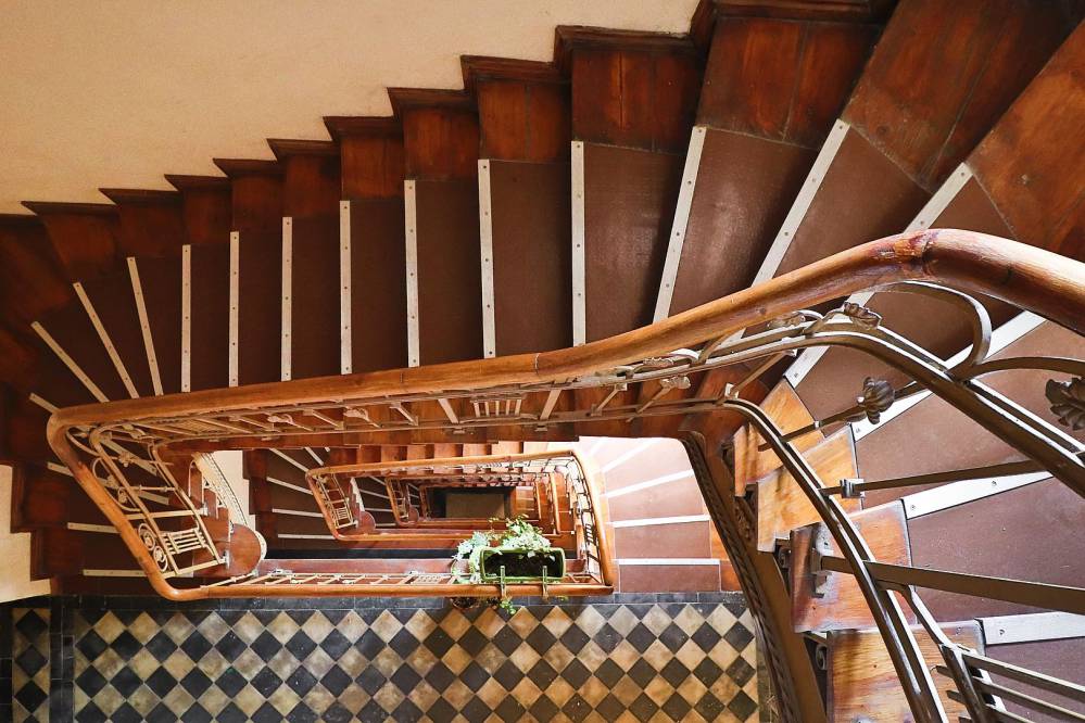 Zaledwie kilka kroków od bytomskiego Rynku, na rogu ul. Webera (dawniej Gräupnerstraße) oraz Jainty (dawniej Tarnowitzerstraße), oczy przechodniów przykuwa nietuzinkowa czterokondygnacyjna kamienica, zaprojektowana przez Konrada Segnitza. Na jej elewacjach dominuje czerwona licowa cegła, idealnie zrównoważona z piaskowcem w poziomie parteru. W płycinach podokiennych znajdują się płaskorzeźby z wizerunkami maszkaronów otoczone secesyjnymi wijącymi się motywami roślinnymi. Wprawne oko zwróci również uwagę na laskę Eskulapa w kartuszu na szczycie elewacji południowej, symbol związany ze sztuką lekarską. W narożu króluje wykusz zwieńczony wieżyczką. Dwa mniejsze, skromniejsze zdobią elewację wschodnią, od strony ul. Webera. Elewacje od podwórza wykończono bardzo praktyczną białą glazurowaną cegłą, stanowiącą zaledwie tło dla finezyjnych balustrad balkonowych. Wejścia do kamienicy strzegą stalowe secesyjne drzwi, bogate w roślinne zdobienia. W przedsionku zaś zostaniemy wręcz zalani zielenią z ceramicznych okładzin ściennych z secesyjnymi kwiecistymi dekorami produkcji Villeroy & Boch Dresden w towarzystwie rubinowych cokołów i listew. Te same dekory, lecz już w tonacji niebieskiej, spotkamy także w Chorzowie, Wrocławiu, Berlinie, a nawet w Londynie. Zachwyt i westchnienia wzbudzi 120-letnia secesyjna zielono-rubinowa kwiatowa mozaika na posadzce, idealnie współgrająca swą estetyką ze ścianami. Tu nic nie jest przypadkowe. W naświetlach drzwi do lokali pomiędzy szprosami wciąż barwią się secesyjne witraże. W części wnętrz zachowała się sztukateria na sufitach. A na wyższe kondygnacje prowadzą zachwycające trójbiegowe schody. To iście koronkowa konst r u kc yjna rob ot a. I nie ma co się dziwić, bowiem zgodnie z sygnaturą zawartą na pierwszej podstopnicy są to „Joly-Treppe” (Schody Joly’ego). Te olśniewające lekkie ażurowe schody zostały wyprodukowane przez Eisenwerk Joly Wittenberg G.m.b.H, założoną w 1889 r. w Wittenberdze wytwórnię żelaza, znaną z produkcji ogniotrwałych schodów. Taka sama konstrukcja wciąż mieści się już tylko w dawnym sanatorium przeciwgruźliczym w Olsztynie. Konstrukcję nośną schodów stanowią pasowe, kratownicowe policzki, wykonane z równoległych oraz ukośnych płaskowników. Usztywnieniem konstrukcji są kratownice, utworzone z pionowych bolców przechodzących przez płaskowniki. Elementy łączone są z podporą platformy w sposób prosty za pomocą kutych żelaznych śrub, bez odciągów i nitów. Dzięki swej lekkiej konstrukcji schody sprawiają wrażenie wiszących. Czy można wyobrazić sobie piękniejsze elementy konstrukcyjne? A wszystko to oświetlone jest przez szklany świetlik nad ostatnią kondygnacją.