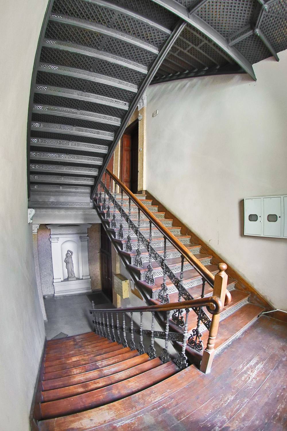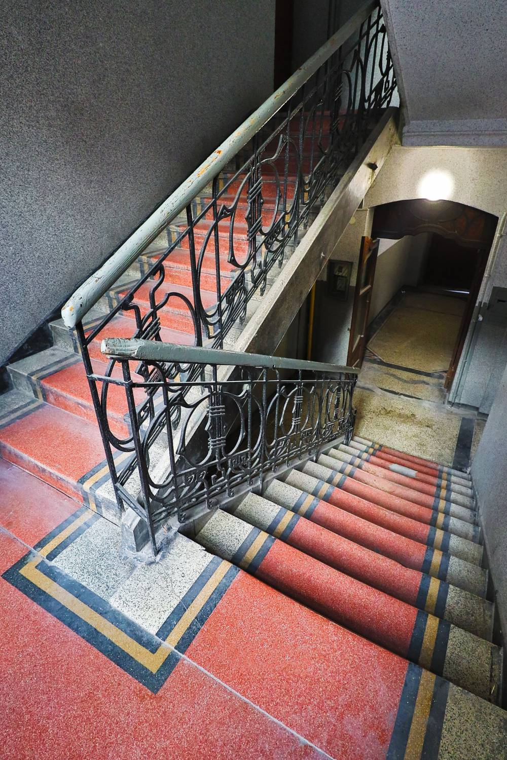 Naprzeciwko najstarszego budynku szkoły w Bytomiu, czyli szkoły muzycznej, na rogu ul. Moniuszki (dawniej Gymnasialstraße) i Jagiellońskiej (dawniej Hohenzollernstraße), stoi dostojna czterokondygnacyjna kamienica. Jej fasady bogate są w liczne secesyjne dekoracje, płaskorzeźby, maszkarony oraz – a jakżeby inaczej – glazurowaną cegłę, bielącą się w poziomie parteru oraz w partiach pionowych pasów powyżej gzymsu pośredniego i podszczytami wieńczącymi wykusze. Ciekawostką jest pojedyncza laska Eskulapa, umieszczona na filarze międzyokiennym w wykuszu od strony ul. Moniuszki. Całość dopełniają subtelne kute balustrady balkonowe, zdobione motywami roślinnymi z zewnętrznymi koszykami na kwiaty. Po przestąpieniu progu tej kamienicy, zaprojektowanej w 1905 r. przez Konrada Segnitza, naszym oczom ukaże się przedsionek z wysokim zielonym ceramicznym cokołem, zwieńczony profilowanym gzymsikiem i uszlachetniony secesyjnymi dekorami z ulubionym motywem secesji ‒ makiem. Dekor ten pochodzi z jednej z najbardziej znanych kaflarni Meißner Ofen ‒ und Porzellanfabrik (M.O. & P.F. vorm. C.T.M.). Miśnieńską Fabrykę Pieców i Porcelany założył w 1863 r. Johann Friedrich Carl Teichert. Wytwory tej fabryki szczególnie upodobał sobie również wrocławski architekt Wilhelm Heller. Umieścił je w dwóch zaprojektowanych przez siebie pobliskich kamienicach: przy ul. Dworcowej 22 (maki na niebieskim tle wraz z secesyjnym wzorem geometrycznym tej samej wytwórni) oraz Moniuszki 8 (maki na granatowym tle). Na wyższe piętra prowadzą wachlarzowe schody w konstrukcji stalowej z ażurowymi podstopnicami. Balustrada schodowa składa się z wykonanych z płaskowników pasa dolnego i górnego oraz skromnego wypełnienia z trzech pionowych prętów pełnych, zakończonych kulkami oraz jednego pręta wygiętego w kształt łuku. Widoczne nity scalają jej elementy zarówno konstrukcyjnie, jak i estetycznie.