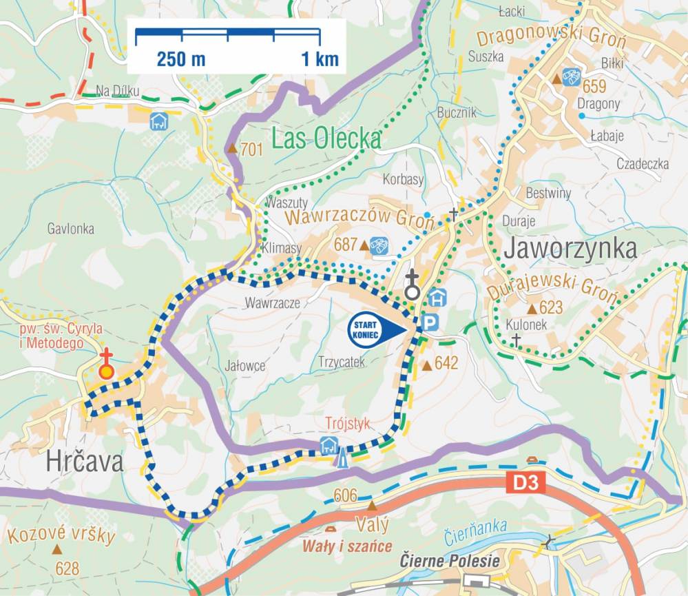 Od Trójstyku idziemy żółtym szlakiem przekraczając granicę polsko-czeską (trzeba mieć przy sobie dowód osobisty albo paszport). Dalej żółtym szlakiem dochodzimy do HERCZAWY (CZ). Kościółek drewniany i karczma „U Sikory” to żelazne punkty wycieczek z Polski. Żółtym szlakiem kontynuujemy wędrówkę dochodząc do przejścia granicznego Jaworzynka Łupienie. Stąd widokową asfaltową drogą wracamy do Jaworzynki Trzycatek.