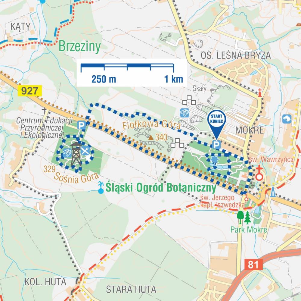 Z Ogrodu Czerwonego wychodzimy w tym samym miejscu, w którym weszliśmy. Wracamy do parkingu, skąd od pieca wapiennego idziemy wyraźną „Ścieżką Przyrodniczą Śląskiego Ogrodu Botanicznego”. Na trasie znajdują się 23 tablice edukacyjne. Odcinek ścieżki wynosi 1,7 km, a jego przejście przez wózkowiczów, wymaga pomocy asystenta. Ścieżką dochodzimy do ul. Sosnowej, przy której znajduje się ogrodzony teren OGRODU ŻÓŁTEGO. Za bramą wjazdową duży parking dla SAM/BUS, a więc można ograniczyć się do zwiedzania tylko tego Ogrodu. Ścieżki Ogrodu Żółtego mają utwardzoną nawierzchnię i ponad 2,6 km długości. Trasę spacerową po nim poprowadzoną możemy ocenić jako łatwą. Odwiedzić należy CENTRUM EDUKACJI PRZYRODNICZEJ I EKOLOGICZNEJ, obiekt przystosowany jest do potrzeb osób z niepełnosprawnościami. Natomiast wieża widokowa (ok. 12 m wysokości) jest dla wózkowiczów niedostępna. W samym centrum przy wieży jest restauracja „Sośnia Góra”, a dzieci mają do dyspozycji place zabaw. Należy wrócić ul. Sosnową i Grudniową do starego pieca wapienniczego. Niestety to odcinek 2,7 km. Jeżeli kierowca busa został przy busie może podjechać pod Ogród Żółty.