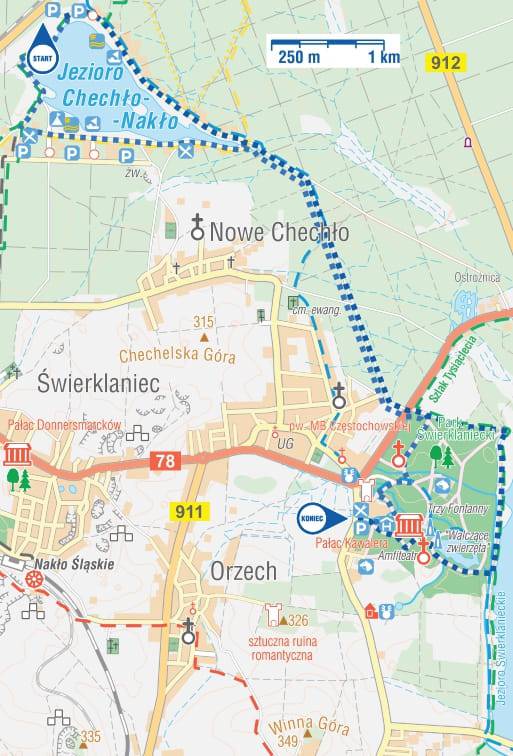 SAM/BUS parkujemy w Świerklańcu na ul. Parkowej, przy restauracji Parkowa. Idąc za znakami niebieskiego szlaku pieszego wchodzimy do parku. Po 200 m od restauracji, po lewej, można dostrzec gruntową ścieżkę, która doprowadzi do ledwo widocznych RUIN ZAMKU. Zamek z XI w. był wybudowany w stylu gotyckim, a po licznych przebudowach budowla miała charakter neogotycki. W 1945 r. zamek spłonął, a to co z niego pozostało wysadzono w 1961 r. Ścieżką parkową wędrujemy do skrzyżowania niebieskiego szlaku z czarnym szlakiem pieszym. Tu skręcamy w lewo i dochodzimy do KOŚCIOŁA PW. DOBREGO PASTERZA (750 m od parkingu). Kościół połączony jest krużgankiem z mauzoleum o bogato zdobionych łukach i filarach. Budowla została zbudowana na wzór berlińskiego Monbijou w latach 1895-1897. Ewangelicka świątynia przeznaczona była dla urzędników hrabiego Donnersmarcka. Po zwiedzeniu kościółka wracamy ok. 100 m i skręcamy w lewo, w gruntową drogę, którą po 600 m dochodzimy do szlaku rowerowego Leśno Rajza. Szlakiem tym przekraczamy DK 78, ul. Kościelną i dalej, leśnymi trasami oznakowanymi zielonym znakami LR, docieramy do ZALEWU NAKŁO-CHECHŁO. Skręcamy w lewo i obchodzimy zalew od południa, mając taflę zalewu ciągle po prawej stronie. Dochodzimy do parkingu przy DW 908. Tu może podjechać kierowca BUS lub SAM, lub możemy wrócić komunikacją miejską. Linia nr 87 i 145. Pytać o przystanek Świerklaniec Park.