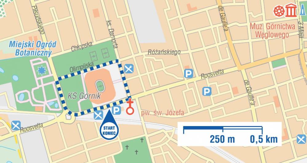 SAM/BUS parkujemy przy ul. Roosevelta naprzeciw ARENY ZABRZE, nowoczesnego stadionu piłkarskiego Górnika Zabrze im. Ernesta Pohla. Z parkingu skręcamy w prawo, idziemy 150 m do KOŚCIOŁA PW. ŚW. JÓZEFA. Wejście do kościoła dla osób na wózkach od strony ul. św. Józefa, wejście po podjeździe przy wieży. Kościół z 1931 r. jest jednym z najcenniejszych przykładów modernizmu sakralnego na Górnym Śląsku. Witraże okienne przedstawiają tematykę siedmiu sakramentów. Z kościoła idziemy do ul. Damrota.