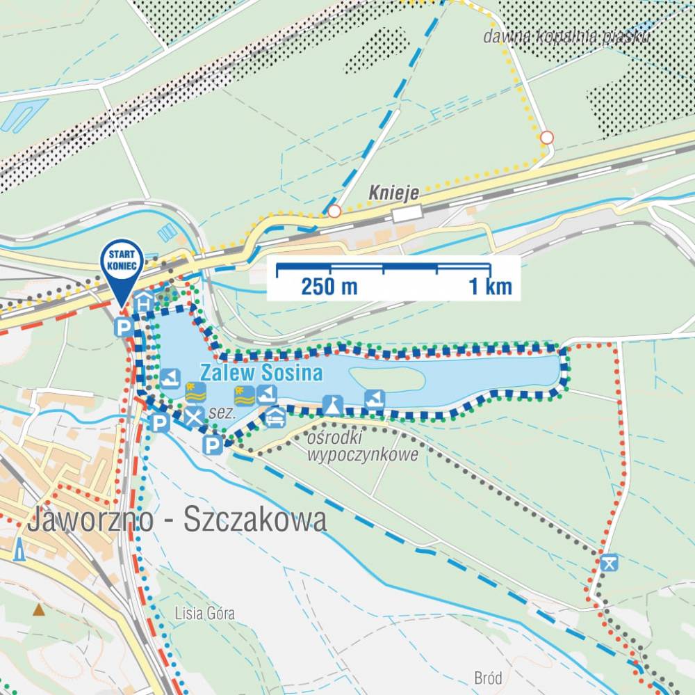 SAM/BUS parkujemy przy hotelu Wodnik ul. Bukowska 10. Od parkingu wędrujemy wygodnymi ścieżkami rekreacyjnymi, wokół Zalewu Sosina. Sztuczny zbiornik w dawnym wyrobisku piasku, to obecnie atrakcyjne miejsce dla letników, z plażą, strzeżonym kąpieliskiem i wypożyczalnią sprzętu pływającego. Przez pierwsze 2,8 km wędrujemy ścieżką za znakami czerwonego pieszego Szlaku Okrężnego wokół Jaworzna. Po 2,9 km szlak czerwony odchodzi od zbiornika odbijając w prawo, a nasza trasa dalej biegnie wygodną ścieżką wzdłuż zbiornika (ciągle po lewej). Na trasie miejsca odpoczynkowe, pomosty. Od tego rozwidlenia do miejsca startu wędrujemy jeszcze 2,5 km.