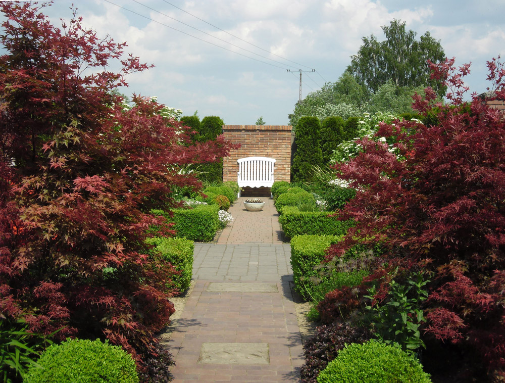 Wszystkie wnętrza ogrodowe są znakomicie zakomponowane, urzekają małą architekturą i bujną roślinnością.