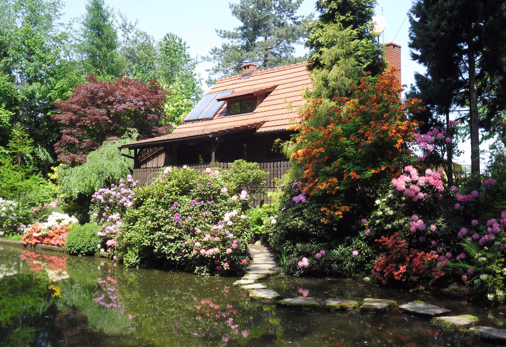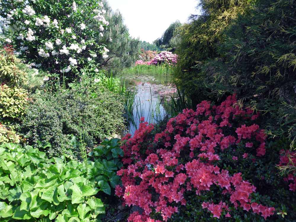 Kwitnącym azaliom towarzyszą funkie i – kwitnące jeszcze w zacienionych miejscach – rośliny cebulkowe. Poszczególne gatunki oznaczone są tabliczkami informacyjnymi, a grupy zorganizowane mogą liczyć na przewodnika. Roślinom towarzyszą różne elementy małej architektury ogrodowej (mostki, murki, wazony), spotkamy tu także niewielki domek gościnny, stojący nad malowniczym stawem.