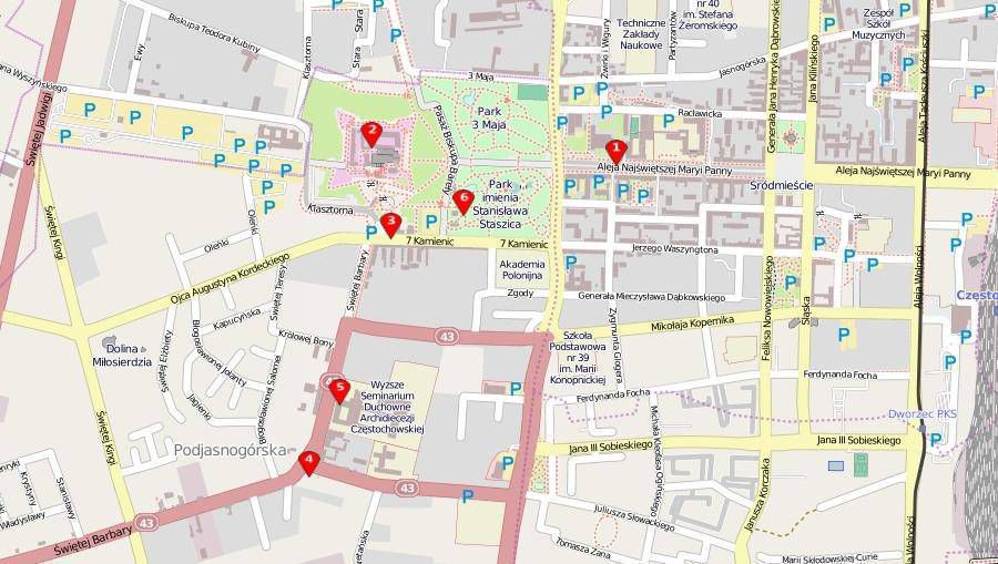 Prowadzi ona reprezentacyjną Aleją Najświętszej Marii Panny na Jasną Górę, gdzie wznosi się słynny klasztor paulinów z cudownym wizerunkiem Czarnej Madonny. Podczas spaceru poznają Państwo bogatą historię tego miejsca, odpoczną także w rozległym parku.