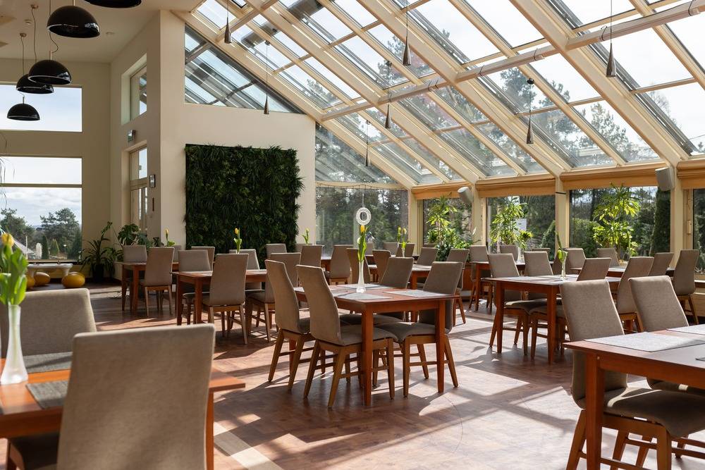 Sala restauracyjna, Ogród zimowy – jasny, pełen zieleni, Sala kominkowa – kameralna i klimatyczna, doskonała na mniejsze spotkania.