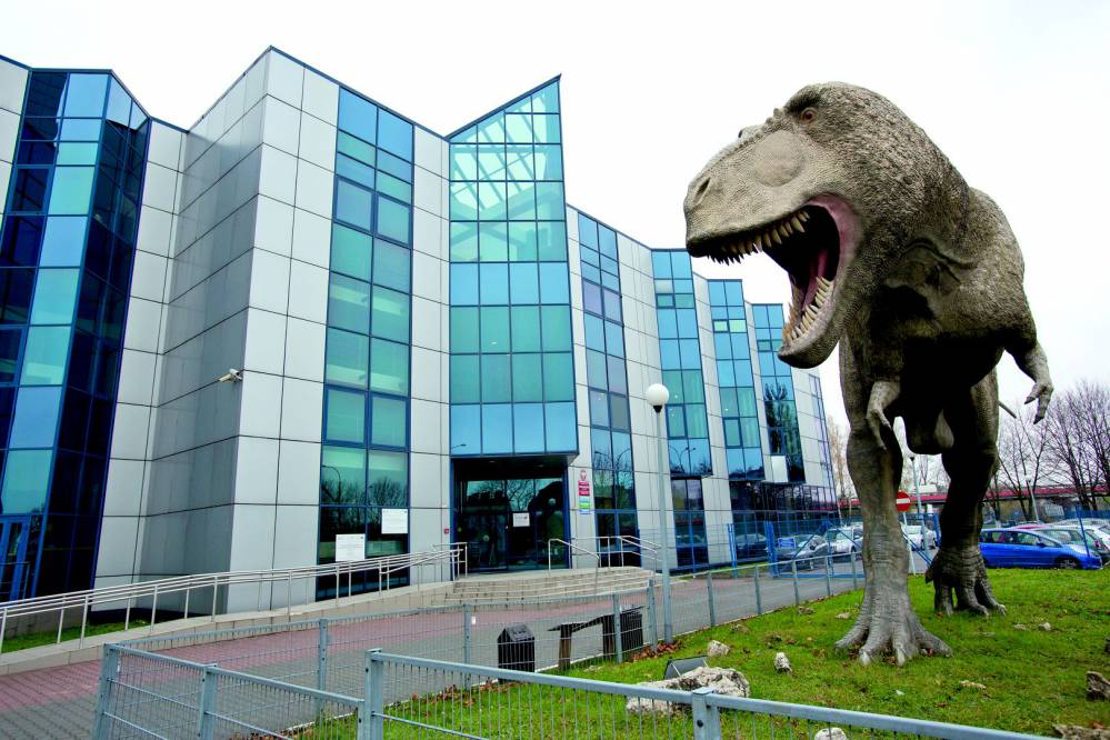Dinozaur przed budynkiem Instytutu Nauk o Ziemi Uniwersytetu Śląskiego, fot. "Muzeum NoZ"