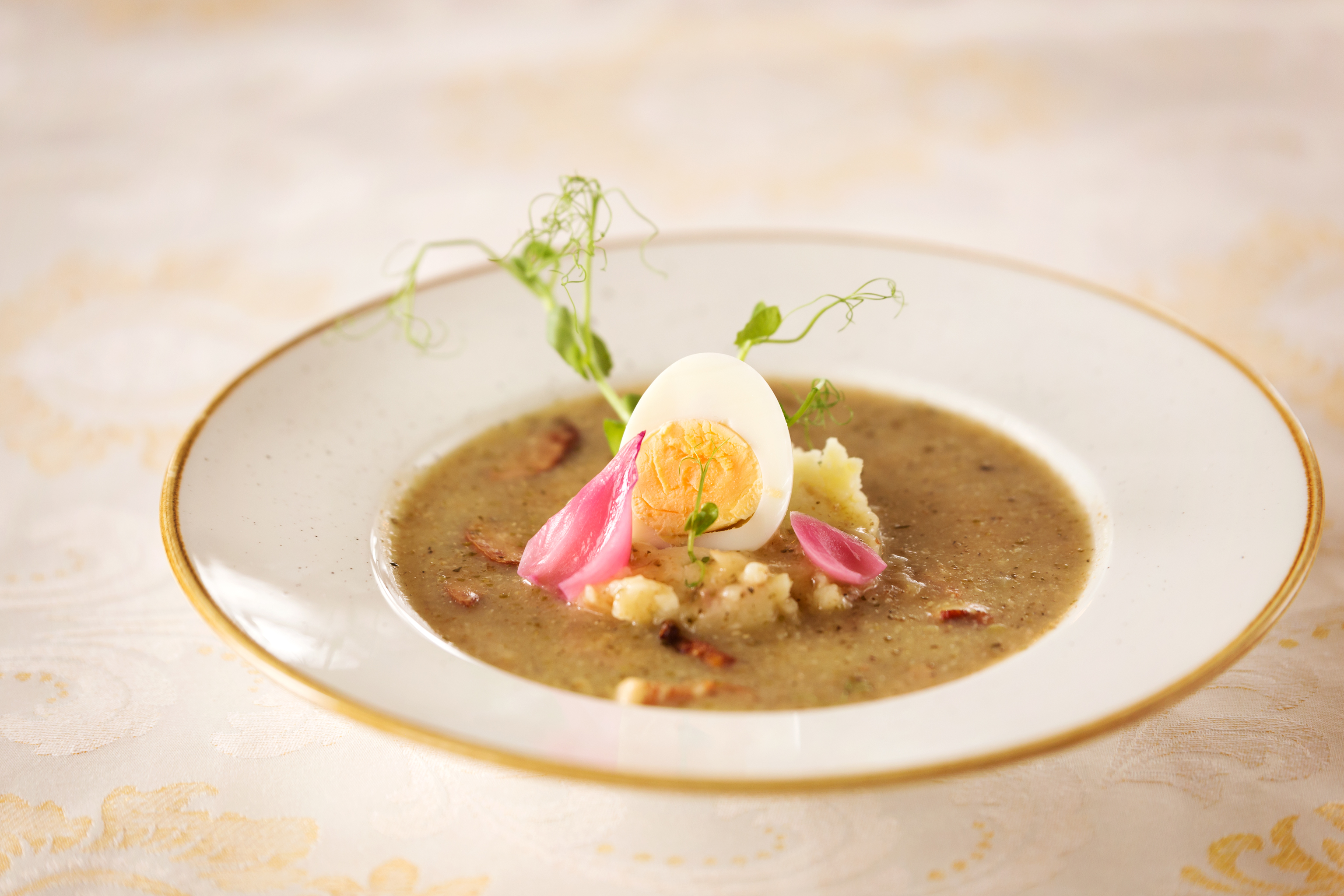 Tradycyjny żur śląski na wędzonce z kiełbasą, jajkiem i kartoflami dymfowanymi z cebulką i boczkiem