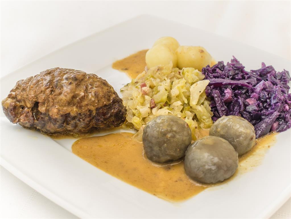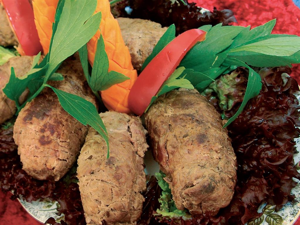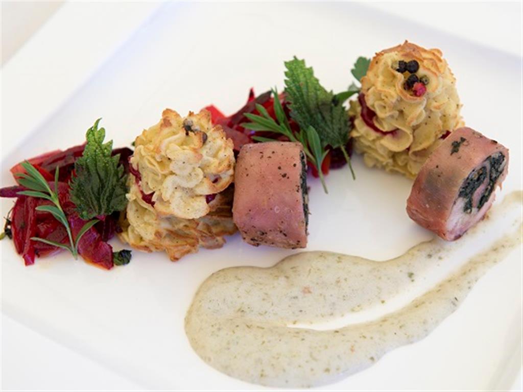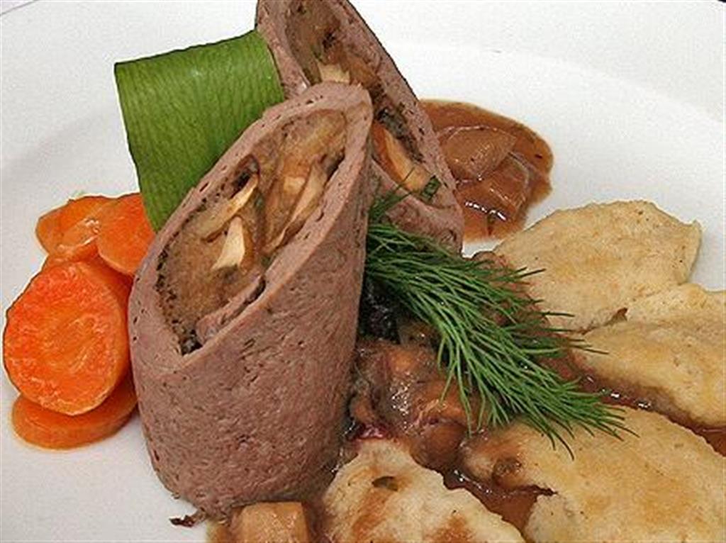 Tuszkę z królika wytrybować, zostawiając comber razem ze skórą z mostka. Przyprawić solą, pieprzem. Nadziać jarzynką z pokrzywy (umytą pokrzywę wrzucić na 2-3 minuty na lekko osolony wrzątek, odcedzić, przelać zimną wodą, osączyć, drobno usiekać, wymieszać z orzechami i zieleniną. W rondlu stopić masło, zeszklić na nim drobno pokrojoną cebulę, dodać pokrzywę i drobniutko usiekany czosnek, sól, pieprz, skropić sokiem z cytryny i chwilę dusić na niewielkim ogniu, dokładnie wymieszać) doprawić chrzanem, na wierzch ułożyć marchew. Zwinąć roladę, owinąć mocno folią. Piec w piekarniku. Przed podaniem obsmażyć na złoty kolor na smalcu.