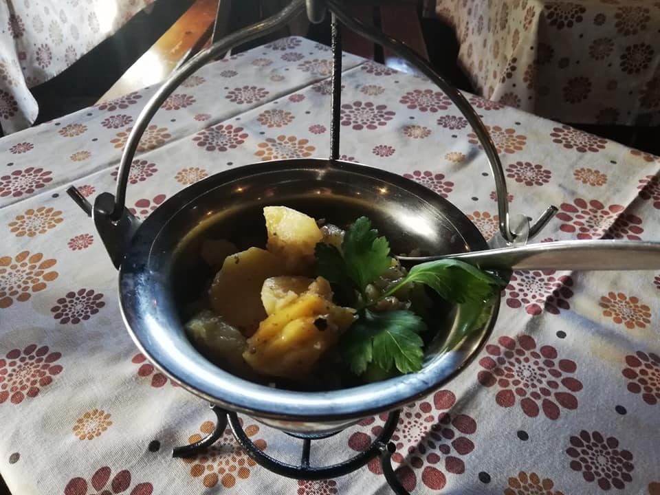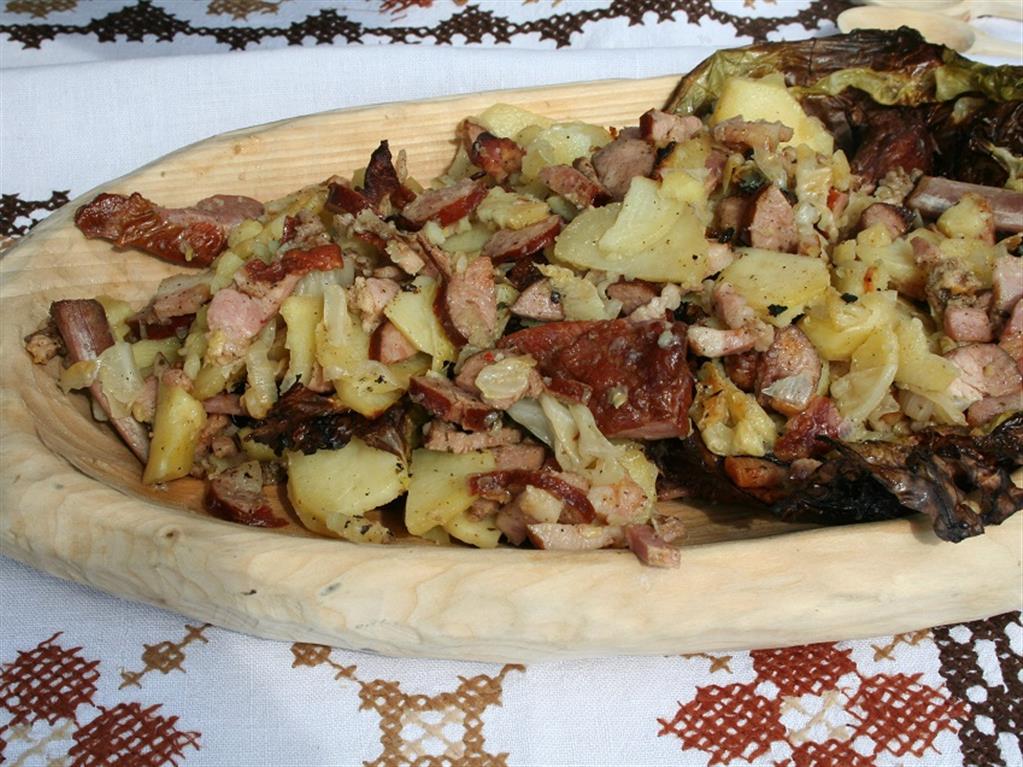 Ziemniaki kroimy na grubsze plastry, marchew, buraki, cebule w cienkie plastry; boczek i kiełbasę kroimy w talarki. Spód żeliwnego naczynia smarujemy tłuszczem, następnie układamy warstwę ziemniaków, marchwi, buraka i cebuli, solimy, pieprzymy, kolejno dajemy boczek i kiełbasę i tak układamy warstwami, posypując przyprawami, do ostatniej warstwy, którą są ziemniaki, wszystko przykrywamy liściem kapusty. Naczynie żeliwne ustawiamy na wolnym ogniu i pieczemy ok. 45 minut.