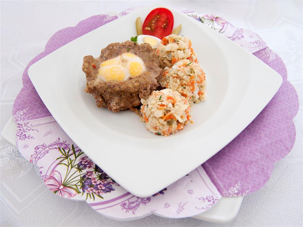 Mięso mielone przyprawiamy do smaku, wbijamy 12 szt jaj przepiórczych, dobrze wyrabiamy i formujemy 4 stożki (wulkan) układamy je na patelni z tłuszczem. Do środka wulkany wbijamy po 4 jaja przepiórcze, patelnię przykrywamy pokrywką i całość pieczemy na średnim ogniu.