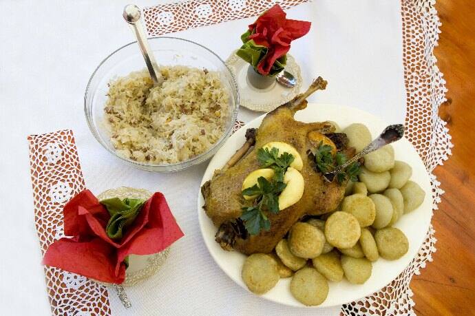 Kaczkę przyprawiamy solą, pieprzem i papryką podpieczoną z margaryną i masłem. Pod koniec pieczenia dodajemy pokrojone jabłka i dusimy jeszcze ok. 15 minut.