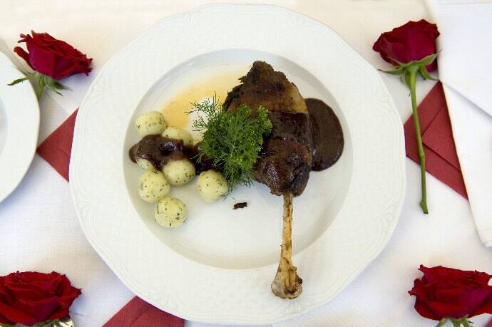 Zamarynowane udko nadziewamy jabłkiem i porem. Następnie pieczemy w 150˚C ok. 3 godzin. Buraki ugotowane w całości kroimy w kostkę grubości 5 min. doprawiamy miodem, czosnkiem, sola pieprzem, podajemy na zimno po 12 godzinach od przygotowania (powinny przejść aromatem miodu i przypraw).