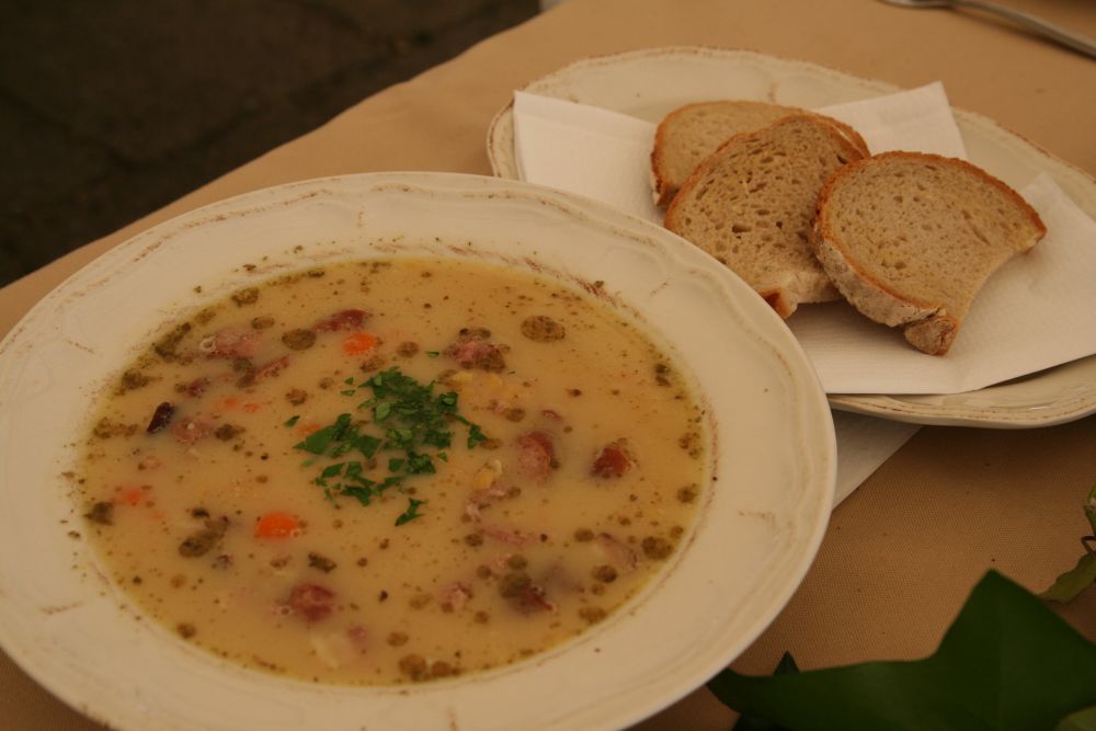 Erbsen spülen und ca. 1 Stunde einweichen. In ca. 2 Liter Wasser Rippchen samt Erbsen und Suppengrün weich kochen. Die Rippchen herausnehmen, in Würfel geschnittene Wurst, Bauchspeck und von den Knochen gelöste Rippenfleisch dazugeben. Majoran zugeben und noch einige Minuten kochen lassen. Zum Schluss mit Mehlschwitze (aus Mehl und Butter) anmachen. Angebratenes und mit Knoblauch aufgeriebenes Brot ergänzt sehr gut diese Speise.